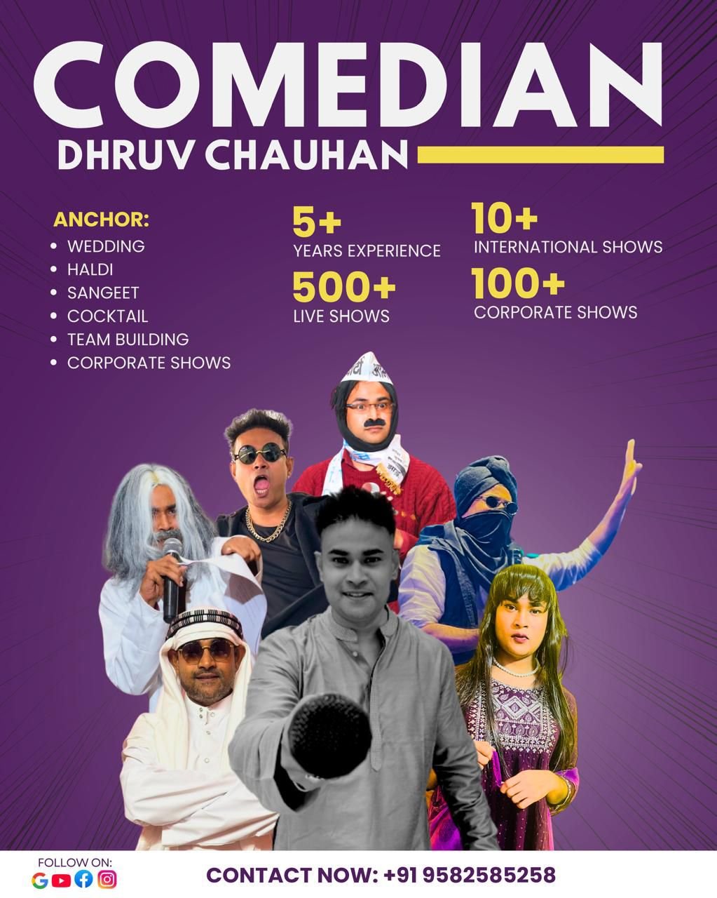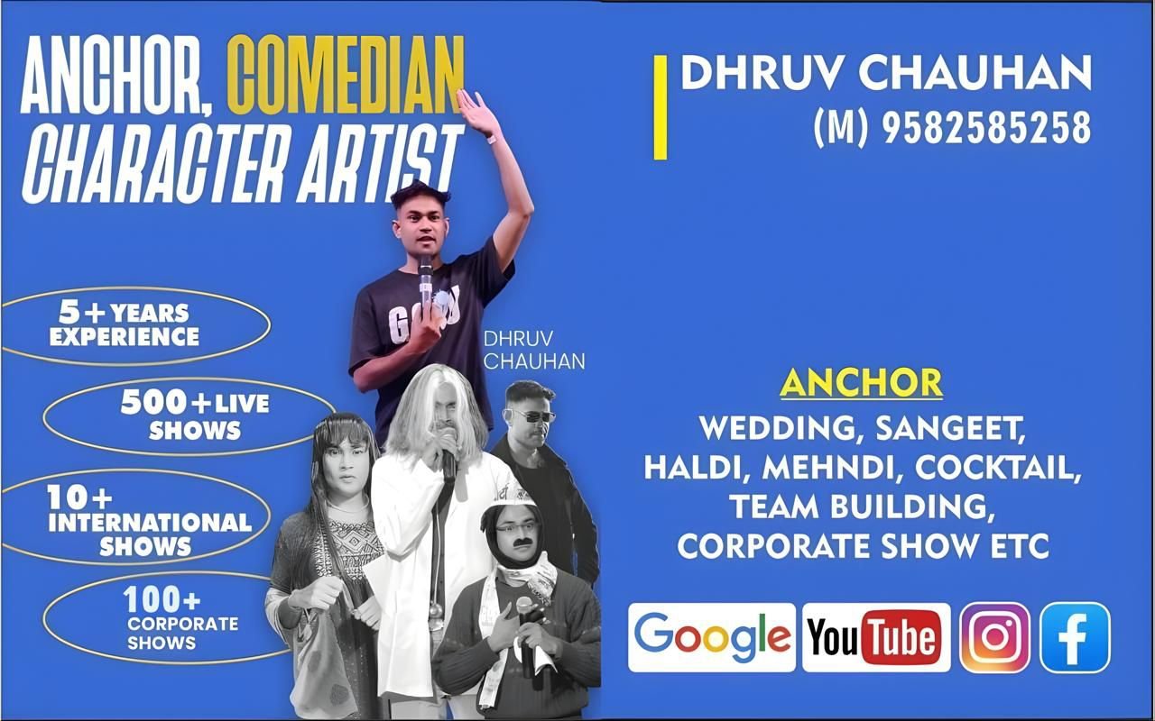 Recognized as the best character artist in Delhi, Dhruv Chauhan combines creativity with performance excellence. His unique talent, stage mastery, and dedication make him a trusted name in the world of entertainment and public speaking. Whether you need a charming host for a wedding or an energetic anchor for a corporate event, Anchor Dhruv Chauhan ensures your occasion becomes a memorable experience for everyone.